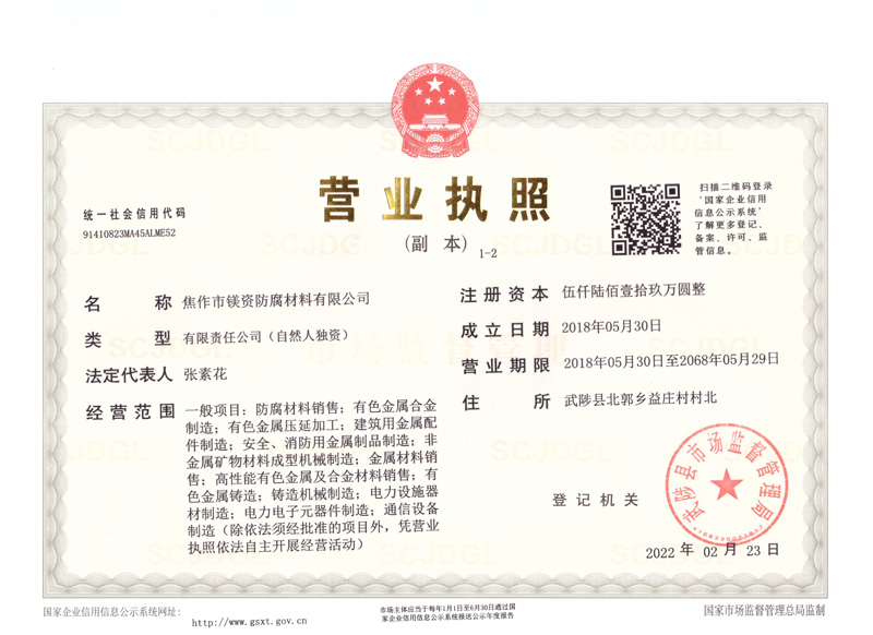 焦作市鎂資防腐材料有限公司網(wǎng)站為您免費(fèi)提供鋅陽(yáng)極,鋁合金犧牲陽(yáng)極,鎂陽(yáng)極等相關(guān)信息發(fā)布和資訊,敬請(qǐng)關(guān)注