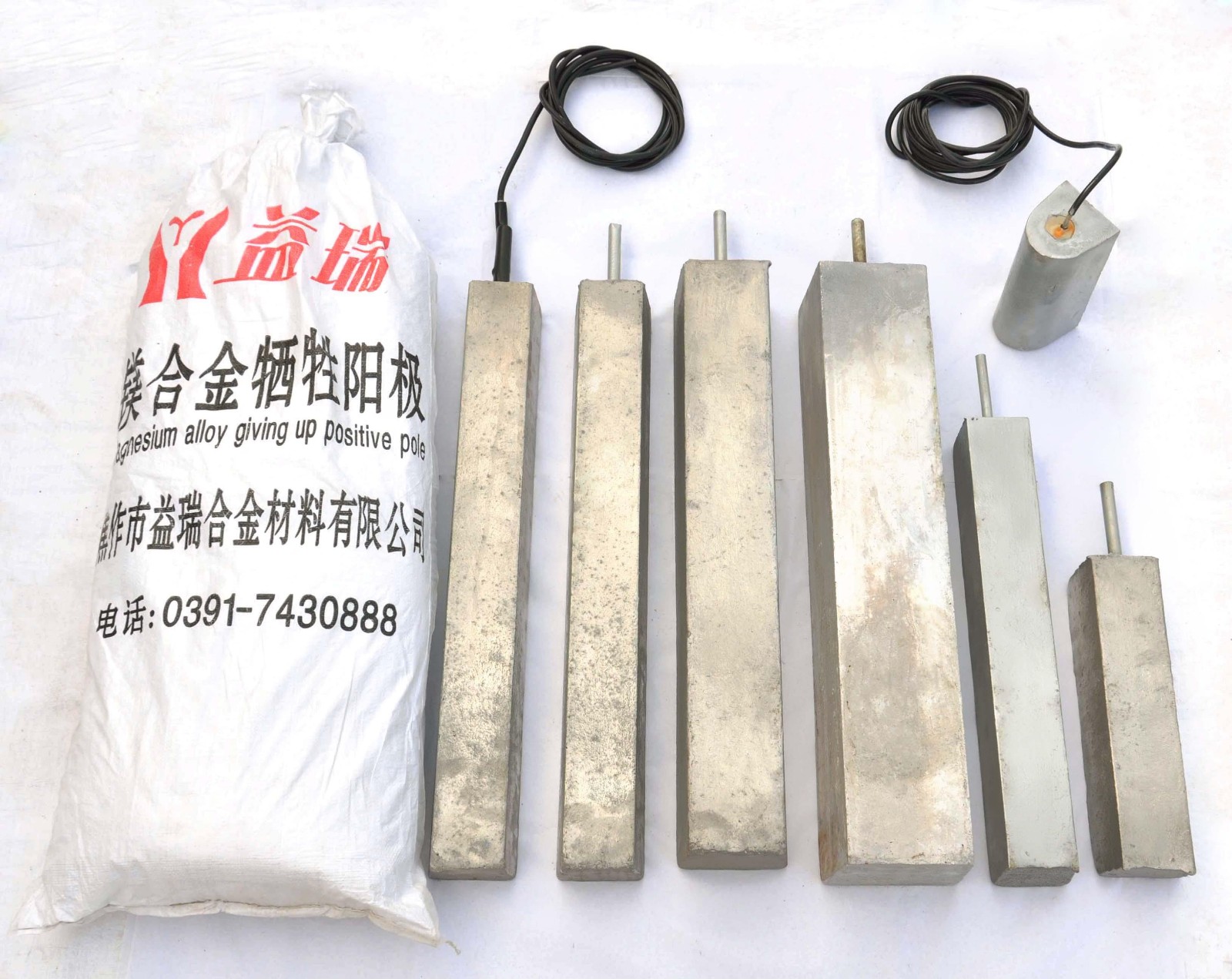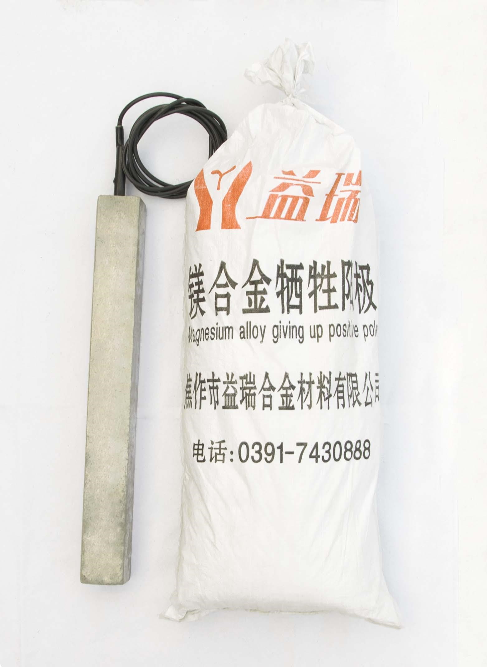 任一型號犧牲陽極一支。 電纜導(dǎo)線一根:按顧客設(shè)計要求長度及規(guī)格焊接在犧牲陽極上,并用環(huán)氧樹脂,氯乙烯熱縮套密封。 專用填料一包;陽極布袋一只。